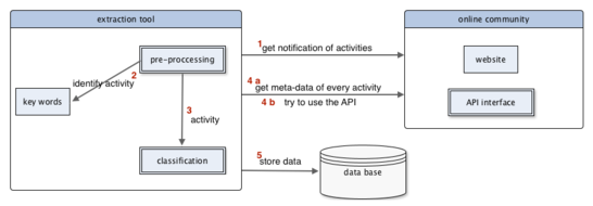 Das online community bietet einen Dienst an, der alle Nutzeraktivitäten in Echtzeit ausgibt. Diese sollen gesammelt werden (1). Mit einem Bündel von Schlüsselwörtern werden die Aktivitäten identifiziert (2). Aktivitäten beinhalten URLs und IDs zu den Autoren und weitere Informationen, die extrahiert (3) und aus der Webseite (4a) oder, falls es einen Dienst für die gewünschten Daten anbietet, von der API Schnittstelle (4b) abgefragt werden. Anschliessend werden die Aktivitäten und die dazugehörigen Autoren und Variablen wie voting score, time stamp, content, context etc. in eine Datenbank gespeichert.