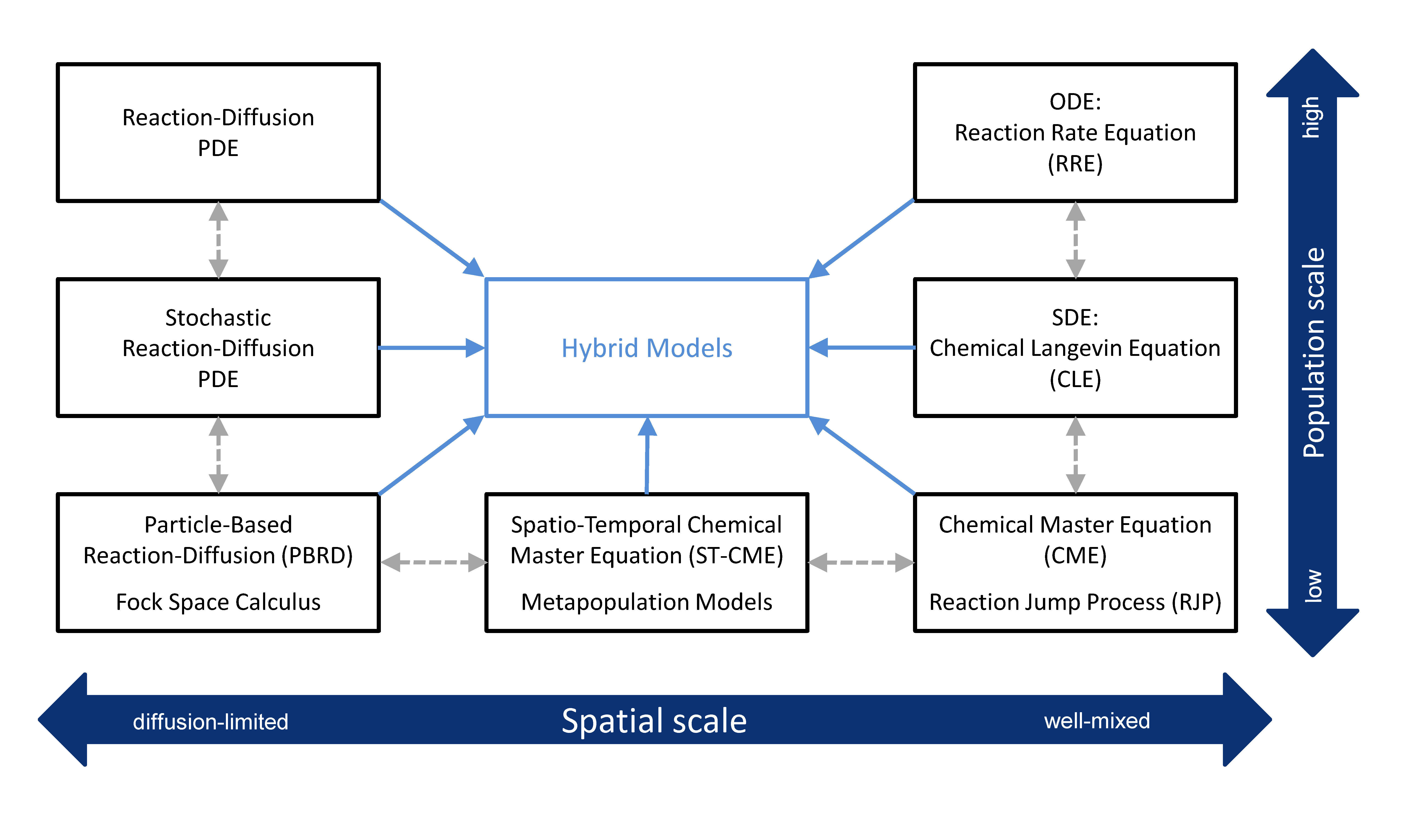 Structural overview of mathematical modeling approaches for chemical reaction kinetics. In project C03, the relation between the approaches (dashed arrows) and their recombination to hybrid models (solid blue arrows) are investigated.