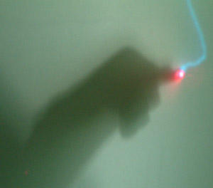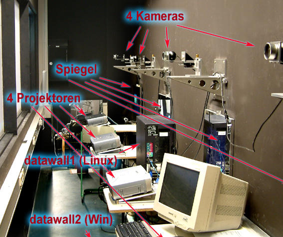 The picture below shows three of the four projectors, which project the signal via one mirror each to the rear side of the projection surface. You can also see the four cameras (simple webcam models) which scan the projection surface and send their video, via four firewire connections, to computer "datawall1" (Linux). The right screen's signal is transmitted at 30 fps to allow fast and precise processing, while the other three video signals are sent and processed but at 12 fps. "datawall1" analyzes the four video streams in real-time. Once the red and bright laser point (see  left picture) is identified in one of the streams, its position will be recognized and, via UDP transfer, converted into a mouse position for the lecture hall computer ("datawall2", Windows XP).