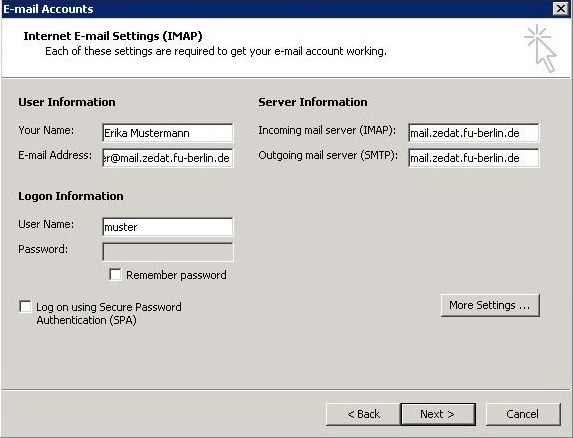 Name, Mailadresse, Empfangs- und Sende-Host, sowie Accountname ausfüllen:
